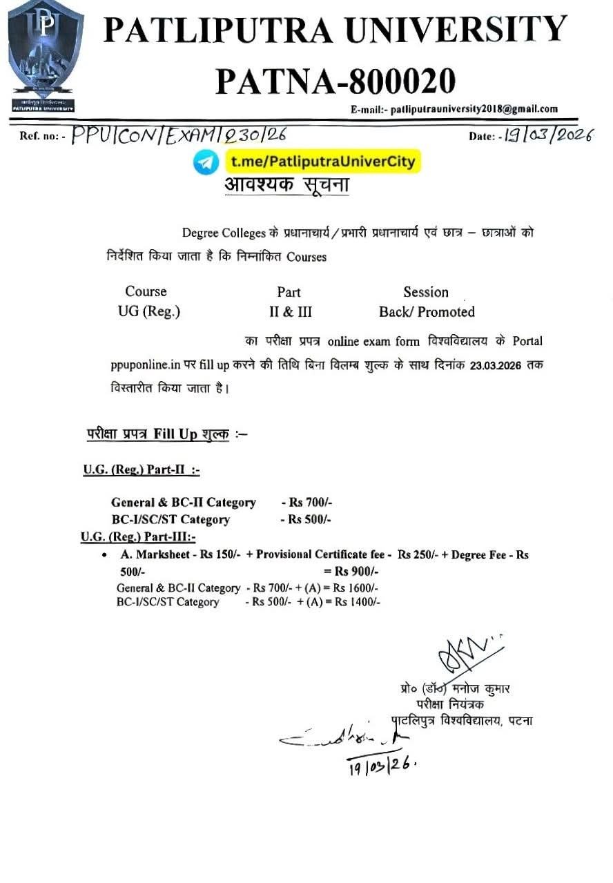 Notice- Examination Form Submission Date has been extended 05/01/2026 for UG( Regular) SEM-IIII 2024-28 -