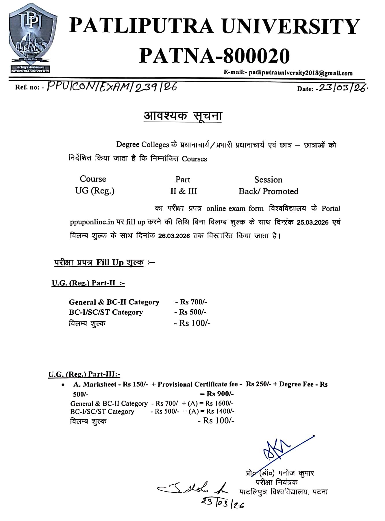 Important Notice : Extension of online examination form filling date of UG(Regular) Part - II &III Students -